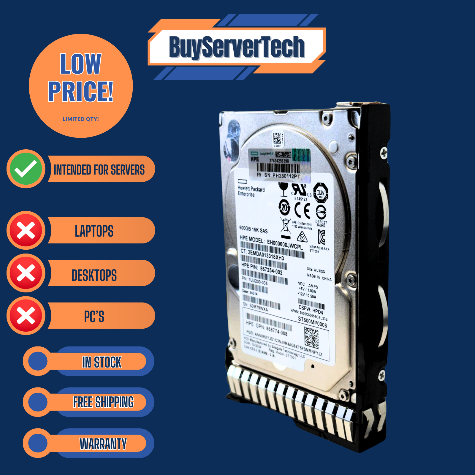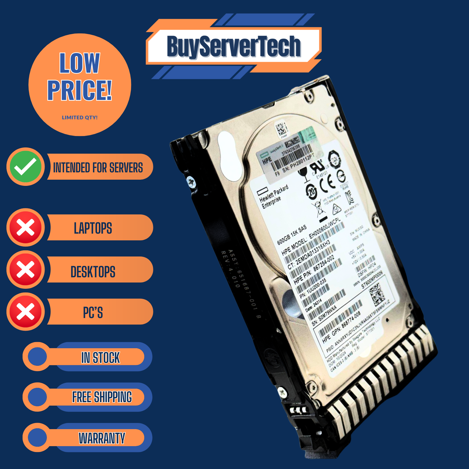 HPE 870794-001 600GB 15K HDD ' HP 870757-B21 SAS SFF Drive ' 600GB 15K RPM SAS 2.5" HDD ' HP DL380 Gen9 Gen10 Compatible HDD ' HPE SmartDrive 12Gb/s HDD ' SAS 3 15K Hot-Swap Drive ' 0 Hour HP Enterprise Server HDD ' 1-Year Warranty SAS Drive