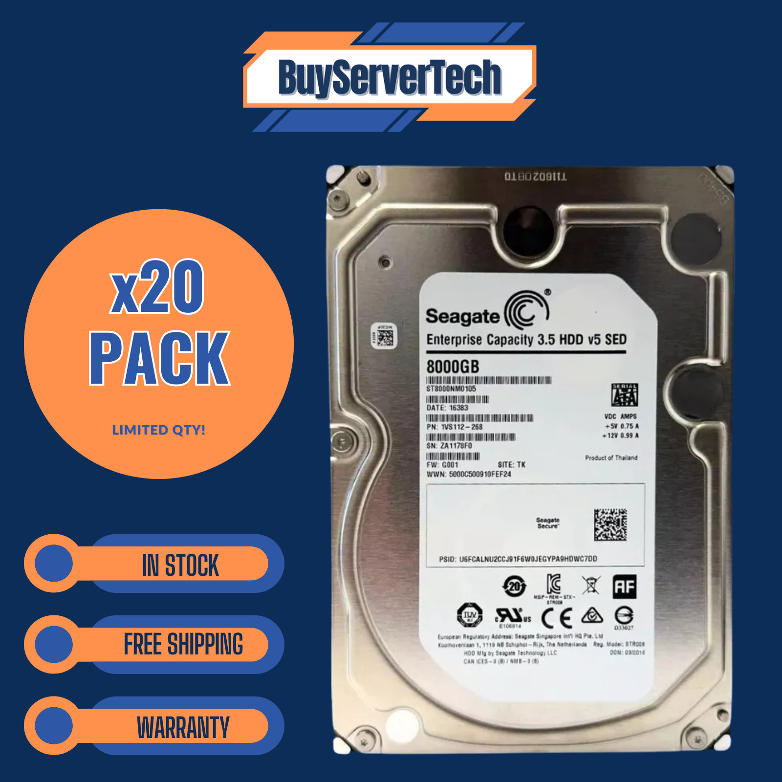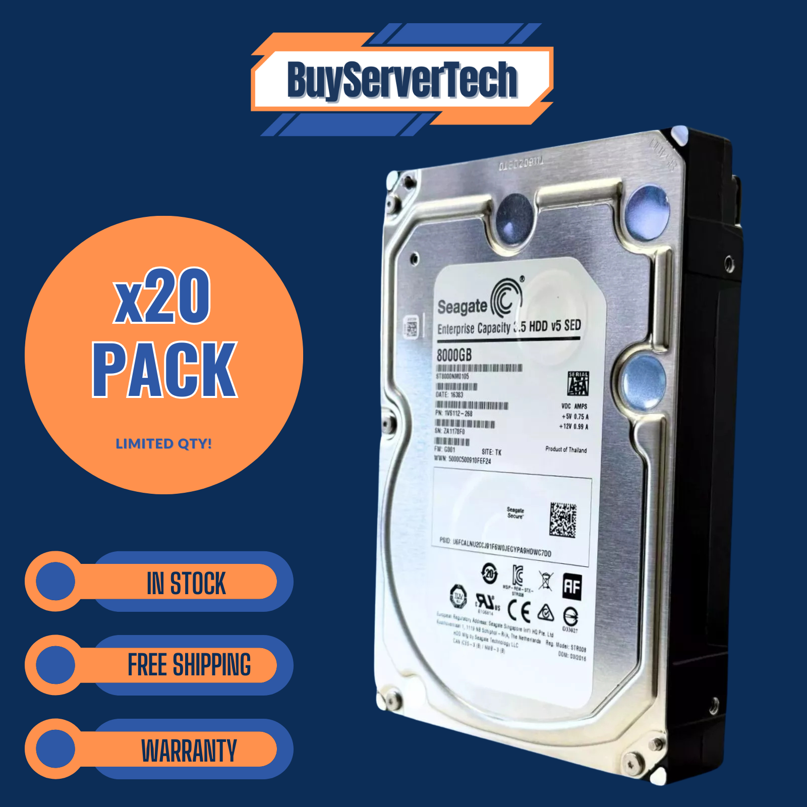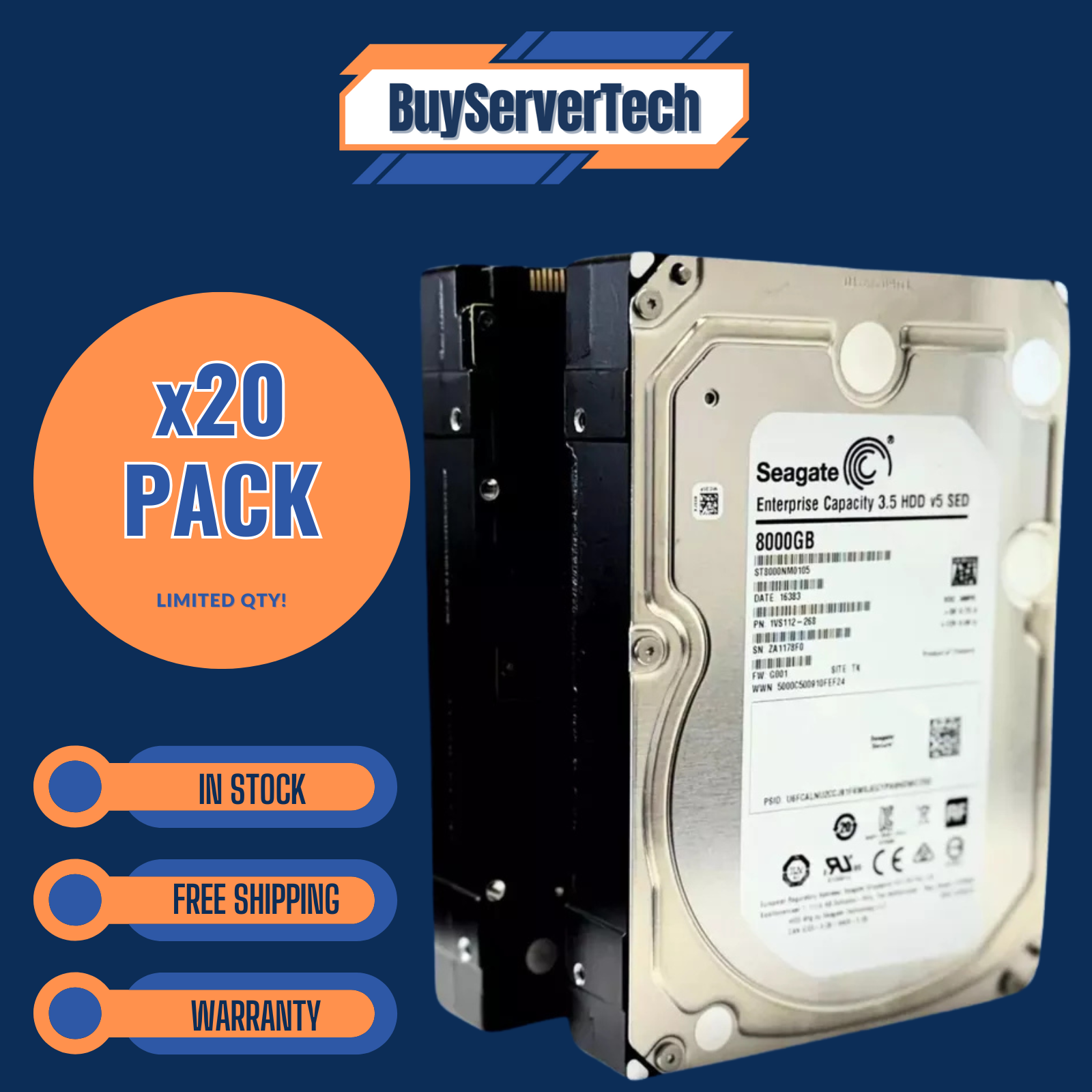 20x Seagate Exos 7E8 ST8000NM0105 8TB 7200RPM 3.5" SATA 6Gb/s Enterprise Hard Drives – 20-Pack Bulk Storage, New, 1-Year Warranty