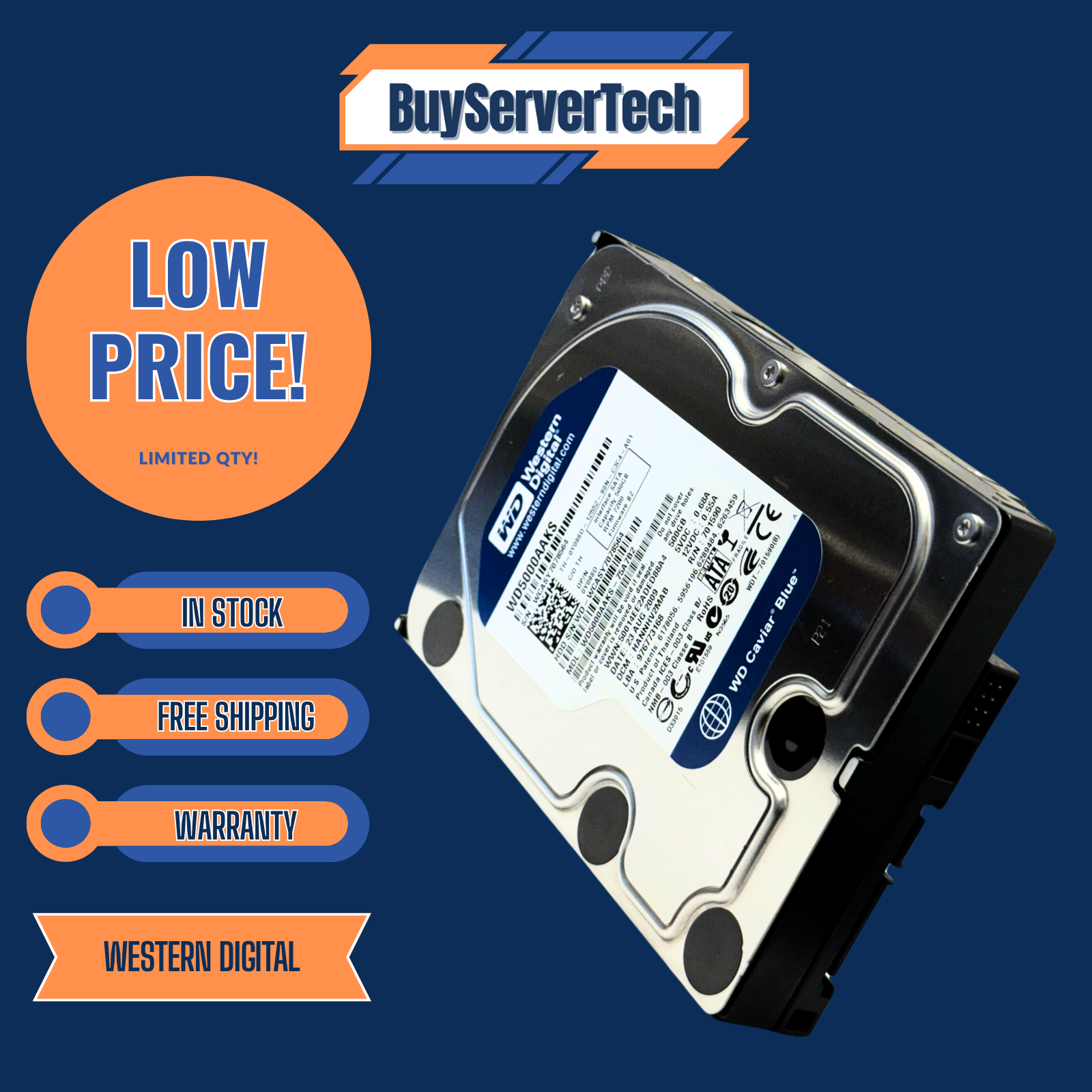 Western Digital WD5000AAKS 500GB 7200RPM 3.5" SATA 3.0Gb/s HDD – New Bulk Packaging, 90-Day Warranty
